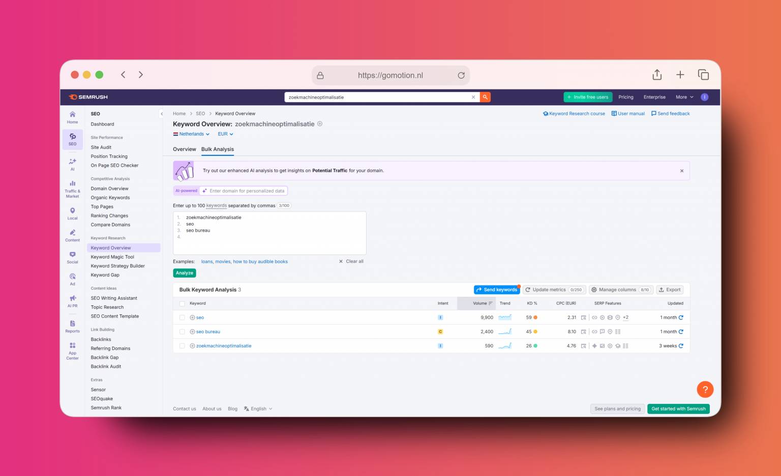 Na de audit zal er een zoekwoordenonderzoek worden uitgevoerd. In een zoekwoordenonderzoek wordt er gekeken naar de zoektermen die in de branche waarin de website actief is, gebruikelijk zijn. Wat is het volume van de zoekwoorden, hoe 'moeilijk' zijn de zoektermen, en wat is de intentie achter een zoekwoord?